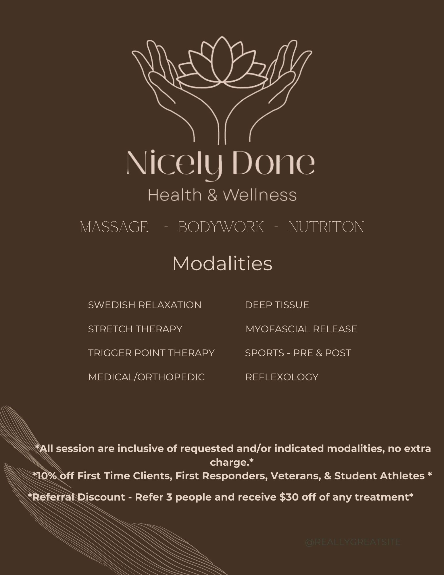 Our services also include sports massage, deep tissue massage, reflexology massage, and therapeutic massage, which combine restorative techniques and targeted pressure to enhance overall wellness. These services complement the calming atmosphere of our wellness spa, where you can unwind and focus on your health and relaxation. At Nicely Done Health & Wellness, we are dedicated to creating personalized experiences that leave you feeling refreshed, rejuvenated, and ready to take on the world. Get in touch with us today and book an appointment.